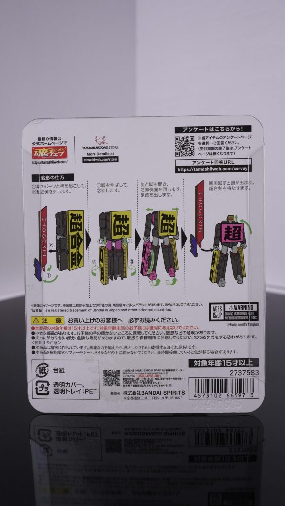 外包裝採用 塑膠吊卡設計,正面以泡殼方式呈現經典超合金 LOGO 作為主視覺, 底圖封面以LOGO 變身為機器人的特效圖案,醒目又充滿收藏感。 特別標註 「合金比率95%」,凸顯近幾年超金合金被嫌玩具塑膠感等詬病差異。 背面印有 四步驟變形圖解說明書,可輕鬆完成 LOGO 變形成持劍機器人。 若想長期保存於包裝泡殼中,建議先將四周膠帶拆除,若購買的是有中文經銷商貼紙, 可用香蕉水或乳液輕拭去除殘膠,就能將玩具完整收藏防止沾上灰塵。