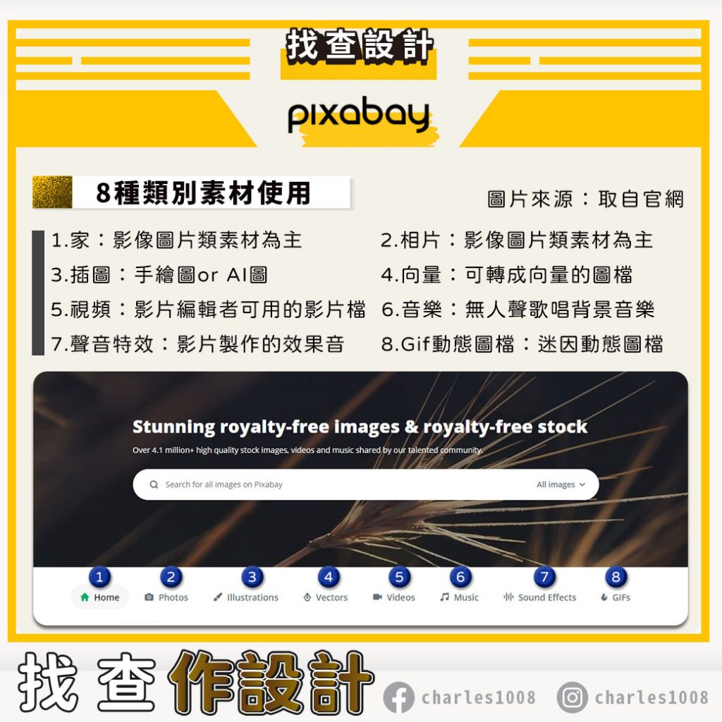 但該網站主要是以影像圖片為主,無影片及插畫圖檔使用。